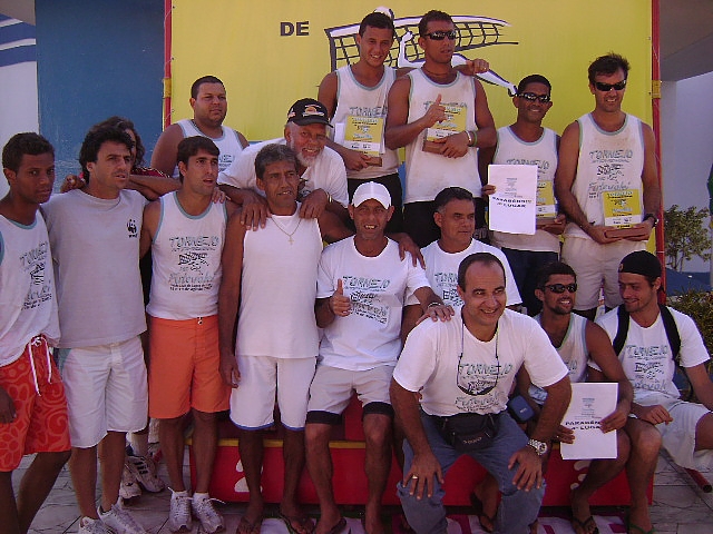 No pódio, a equipe do Futevolei.com.br com os organizadores e campeões